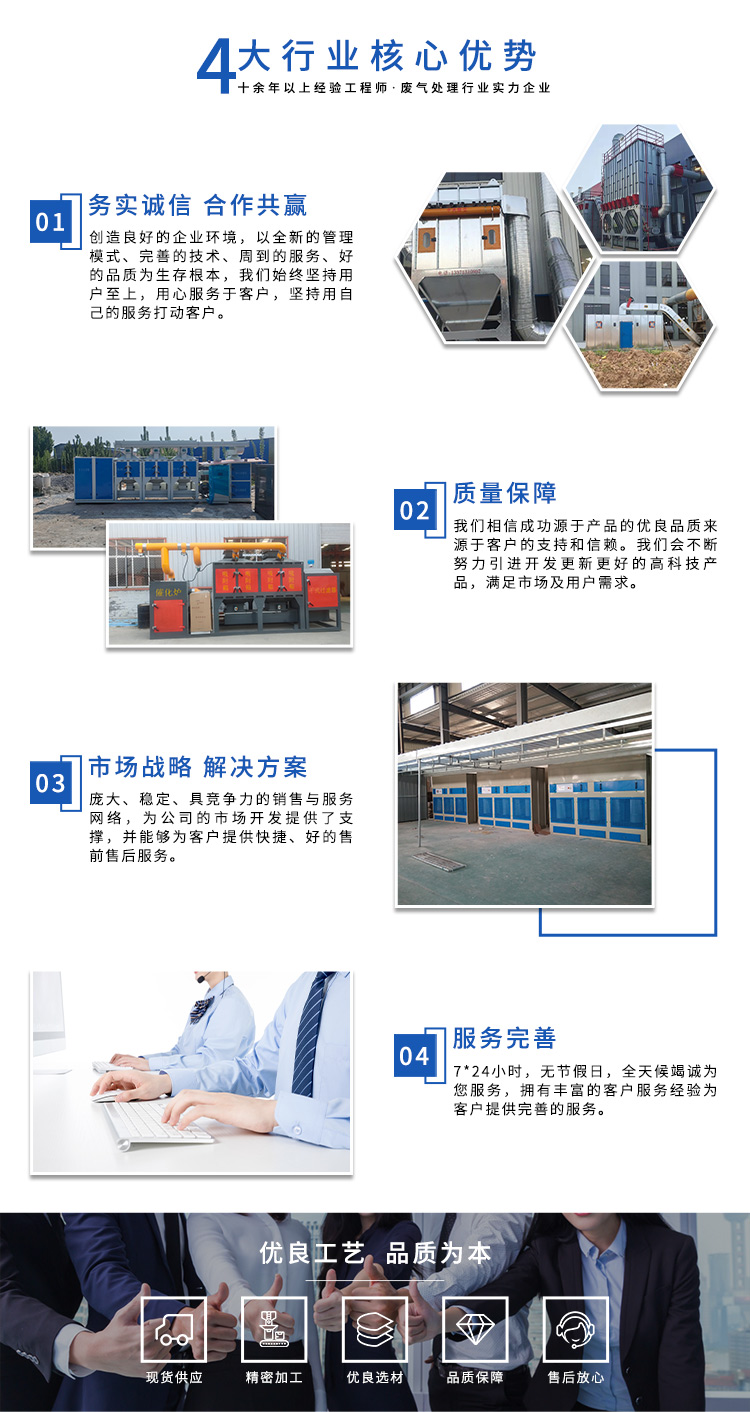 公司以其獨特的技術和專業化、成套化先進設備在行業內樹立了一面鮮明旗幟,打造出眾多技術含量高、質量過硬、效果優(yōu)異的示范工程。設備廣泛適用于各類VOCs有機廢氣、橡膠及PVC廢氣凈化、噴涂廢氣凈化、機械加工、金屬加工、建材、酒店餐飲及醫(yī)院學校等公共事業區域的廢氣和油煙治理。